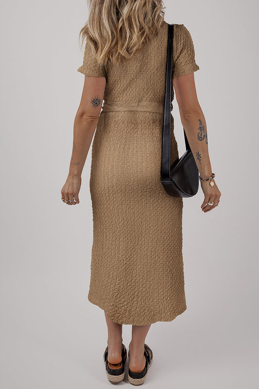 Short Sleeve Textured Button Up Tie Waist Long Dress in Buckskin