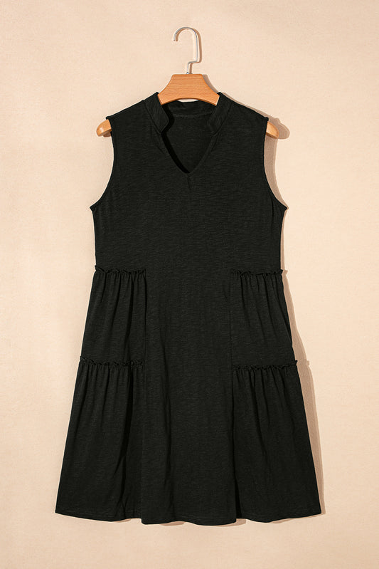 Split V Neck Tiered Flowy Sleeveless Dress in Black